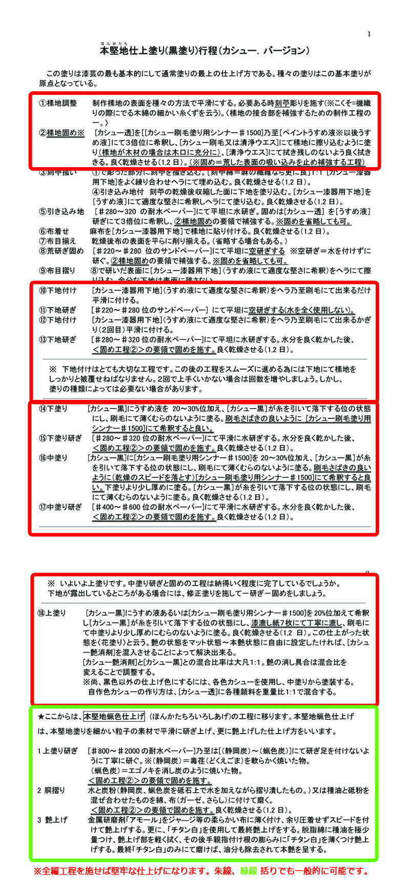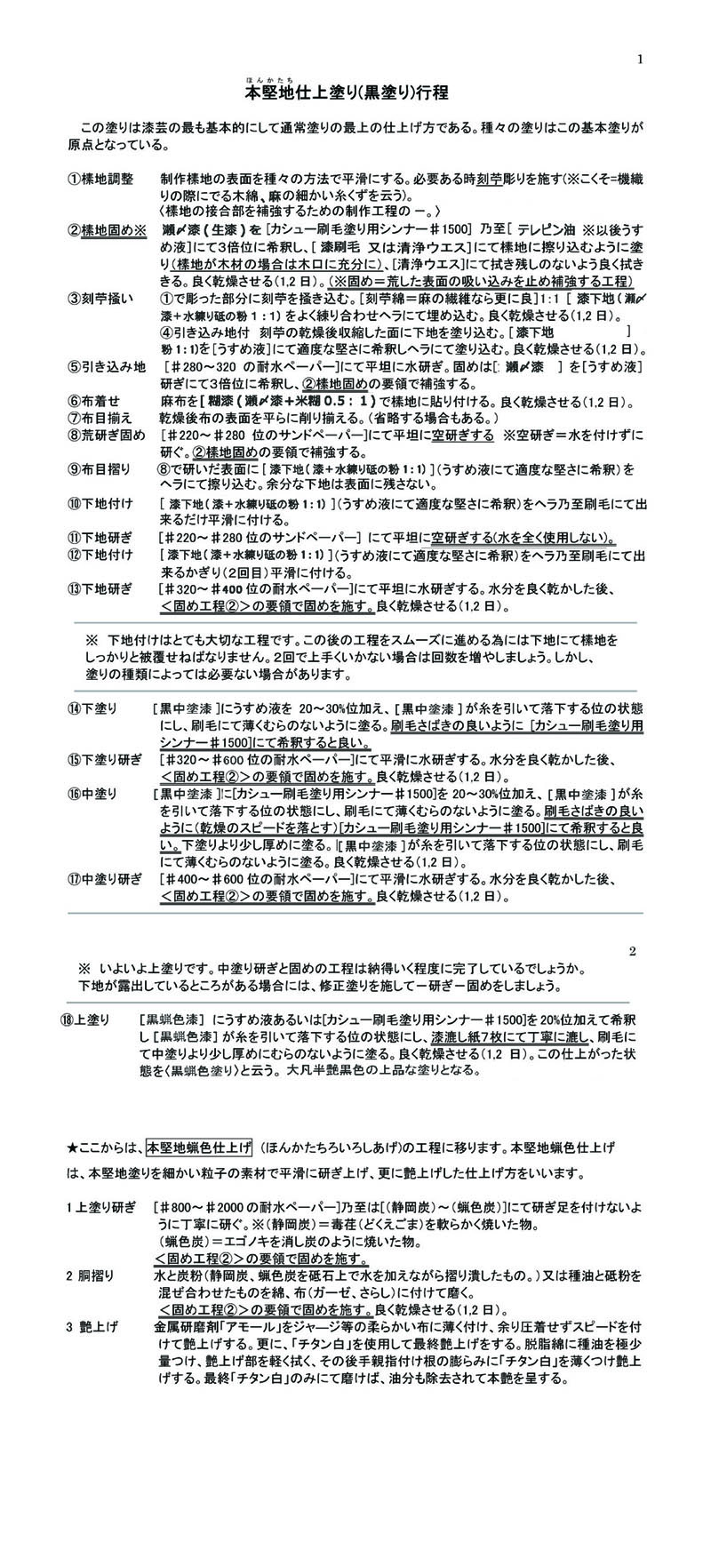 本堅地(ほんかたぢ)黒塗りの漆工程表とカシュー工程表を記します。漆塗りに参考にして下さい。