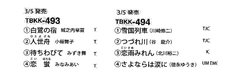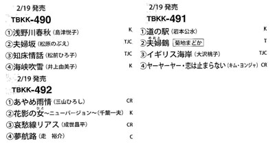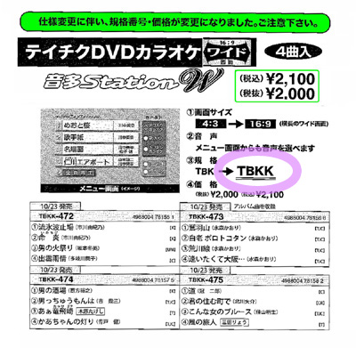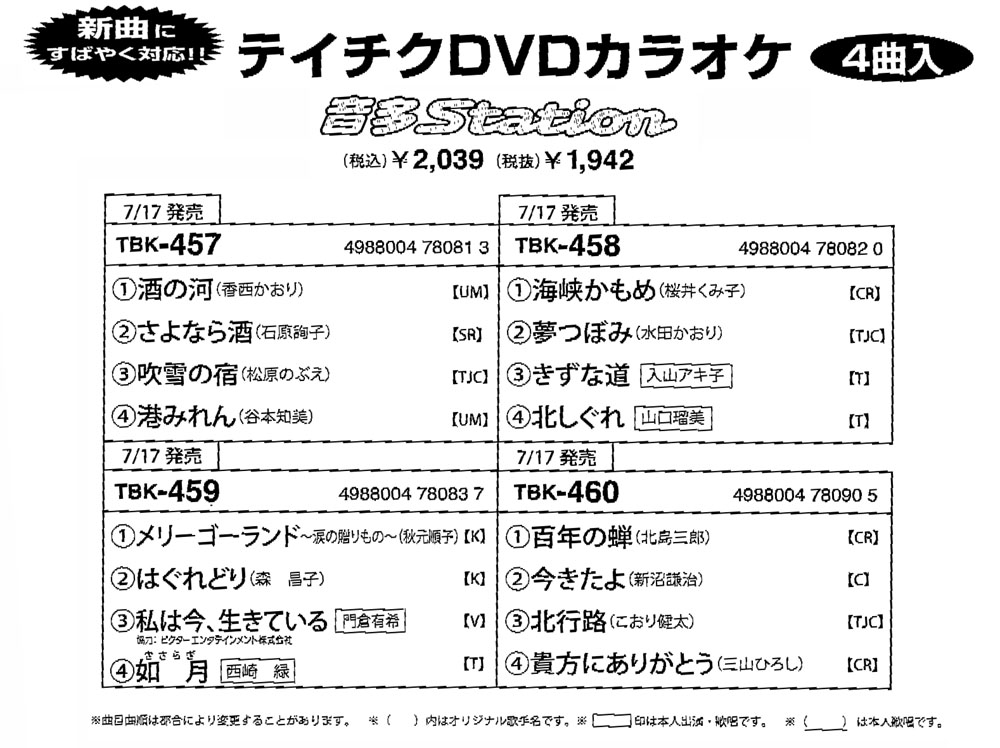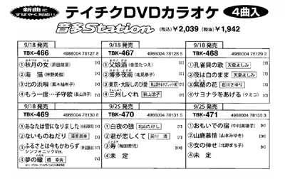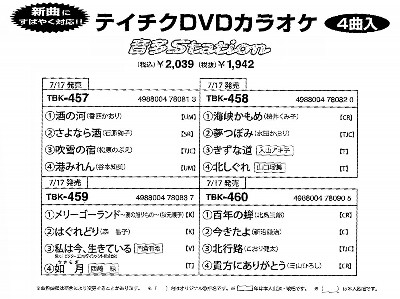 <●売れます●売れてます>DVD(4曲) ●TBK /2039●KIBK /2000●CRBK /1600 ◆ テイチク(DVD) ◆テイチク カラオケ新譜情報 / 月別発売詳細 / カラオケDVDアイウエオ検索 ◆ キング DVDカラオケカタログ ◆クラウン DVDカラオケ カタログ